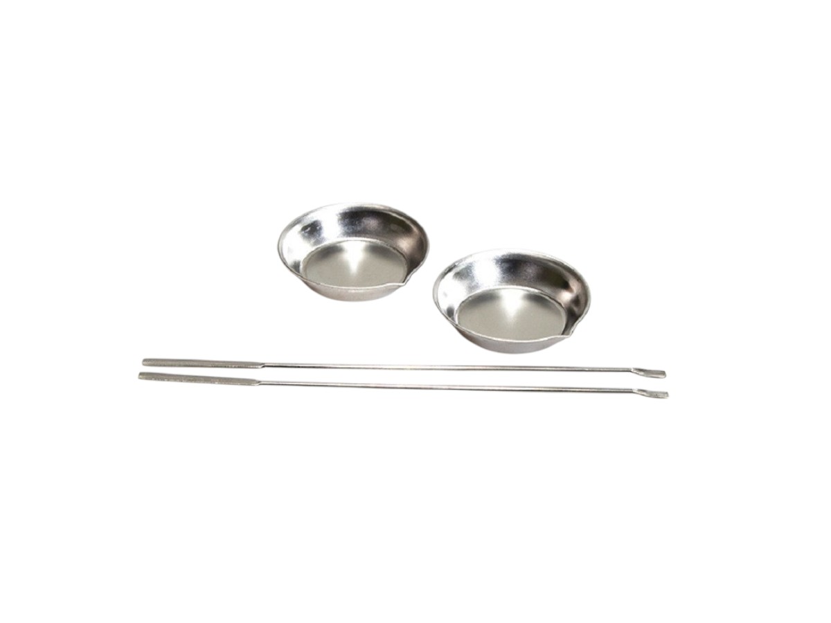 Включает в себя две металлические ёмкости и двусторонние палочки (ложечка-шпатель).