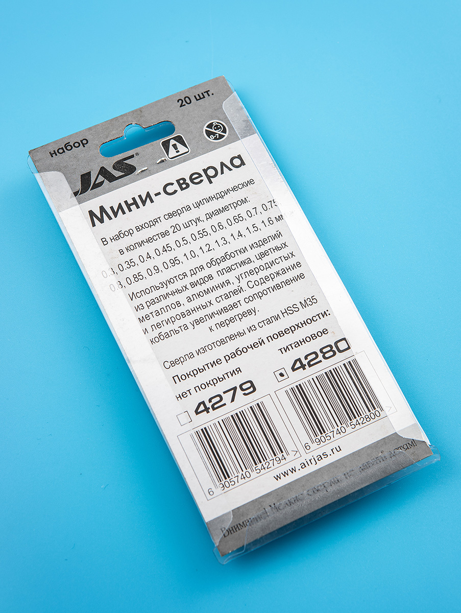 4280 JAS Мини-сверла, диаметр 0,3 - 1,6 мм, набор, 20 шт., HSS М35, нитрид-титановое покрытие