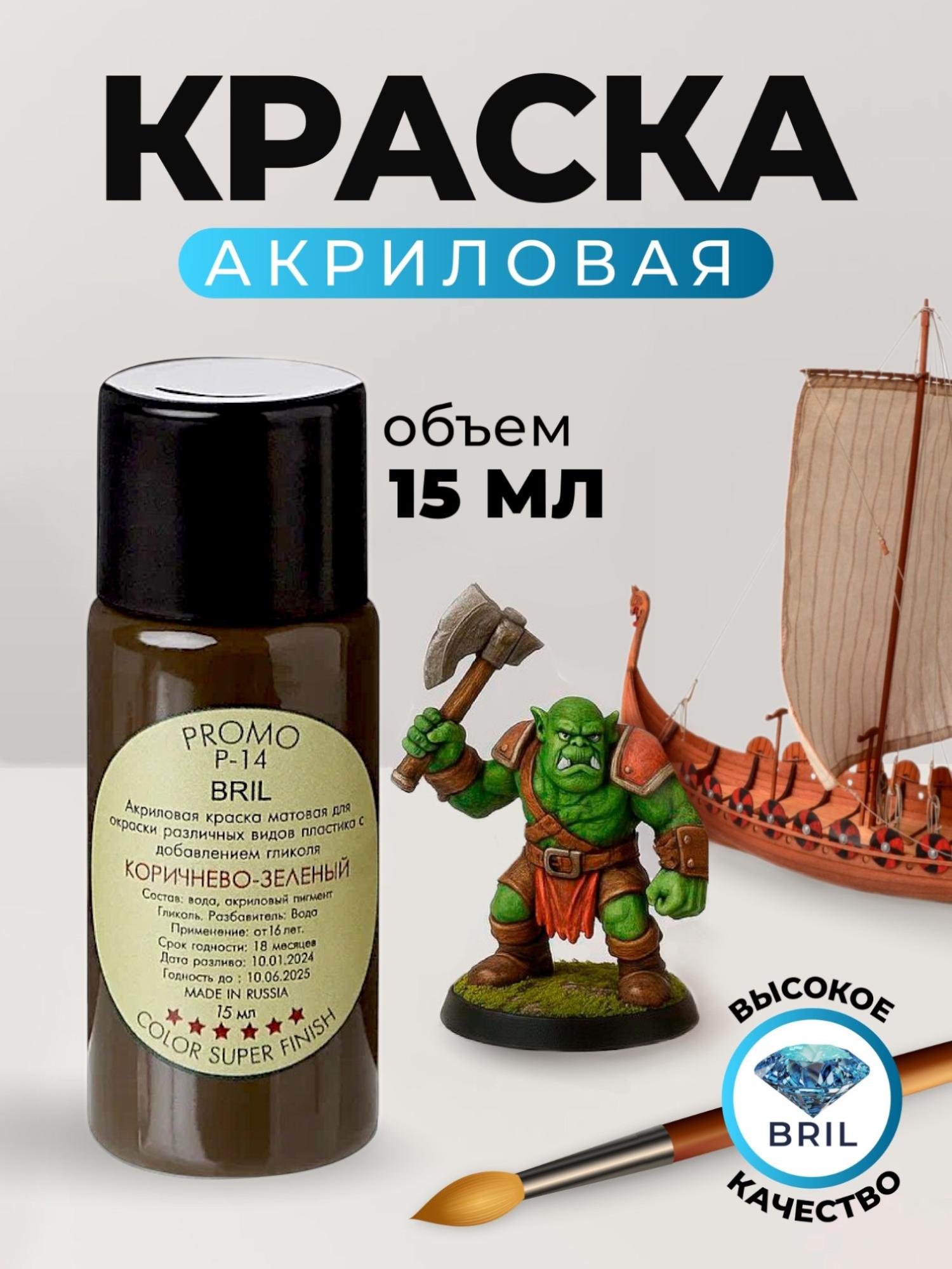 Краска акриловая BRIL 6008 Коричнево-зеленая матовая, 15 мл.