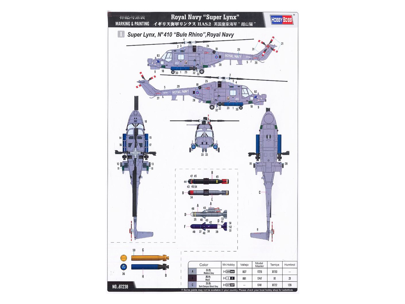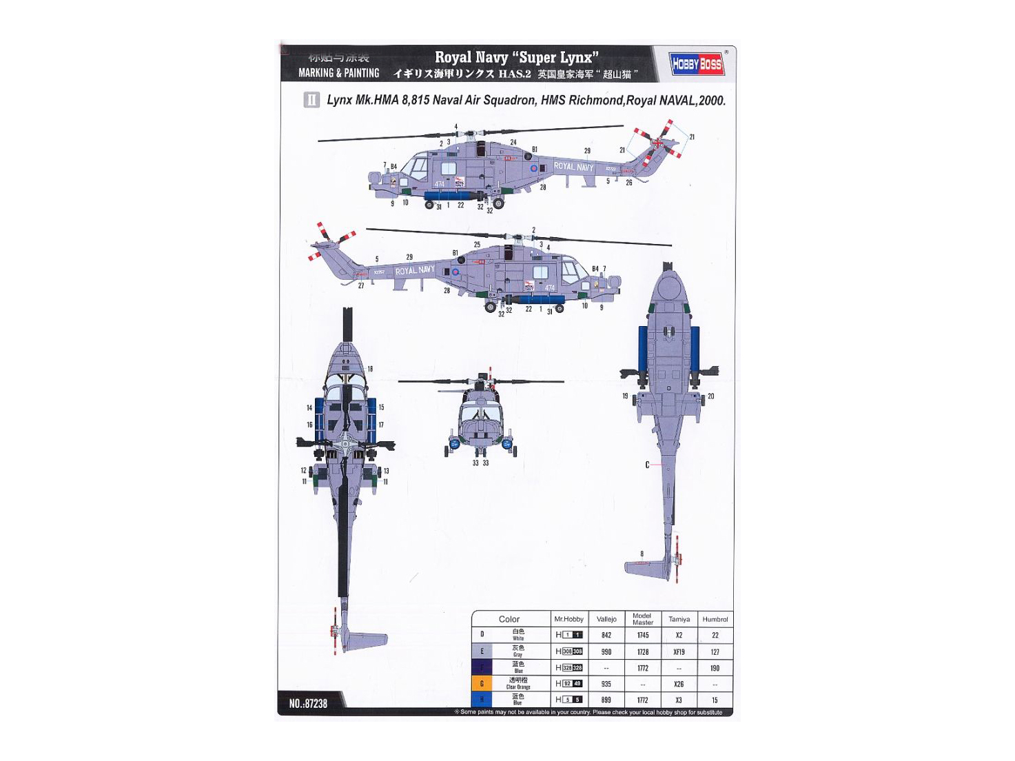 87238 HobbyBoss Противолодочный вертолёт Royal Navy Super Lynx (1:72)