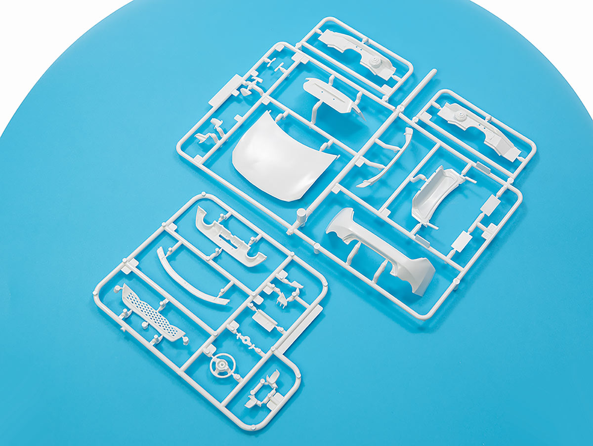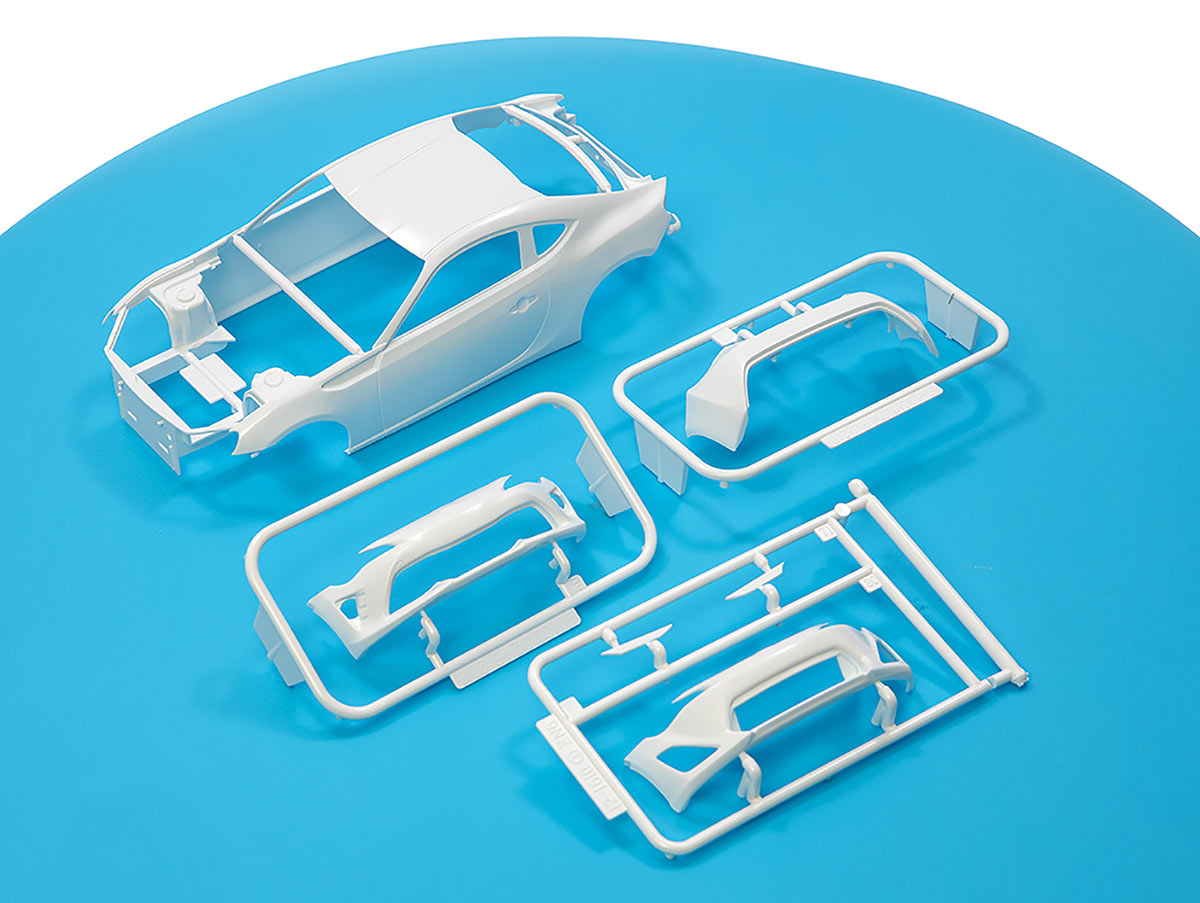 Кузов отлит единой деталью из пластика белого цвета. Капот, бампера и крышка багажника даны отдельно.