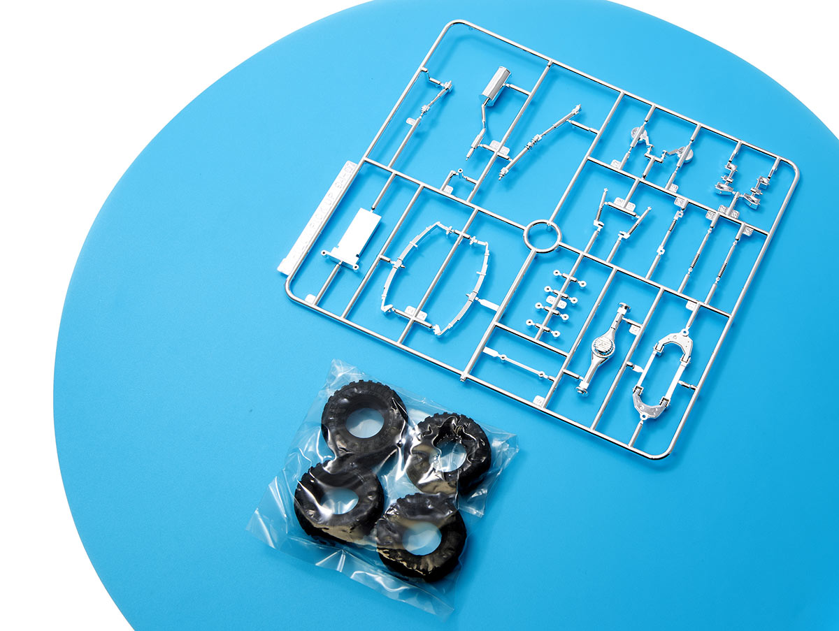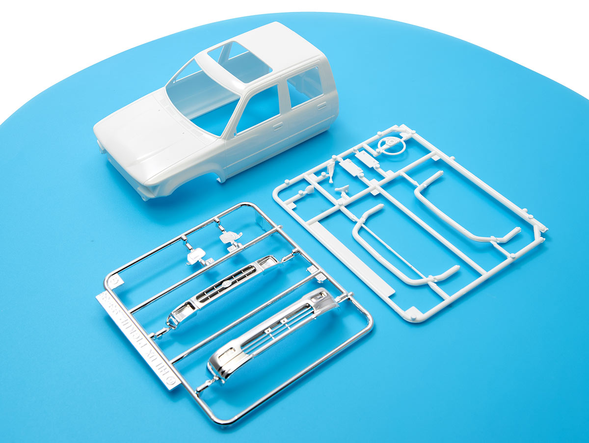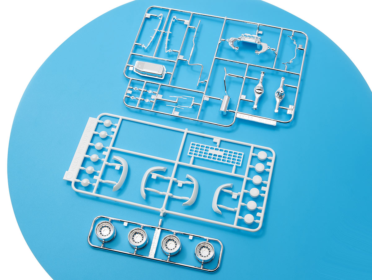 Множество деталей из яркого хромированного пластика для колёсных дисков, решёток, отражателей фар, зеркал и элементов подвески.