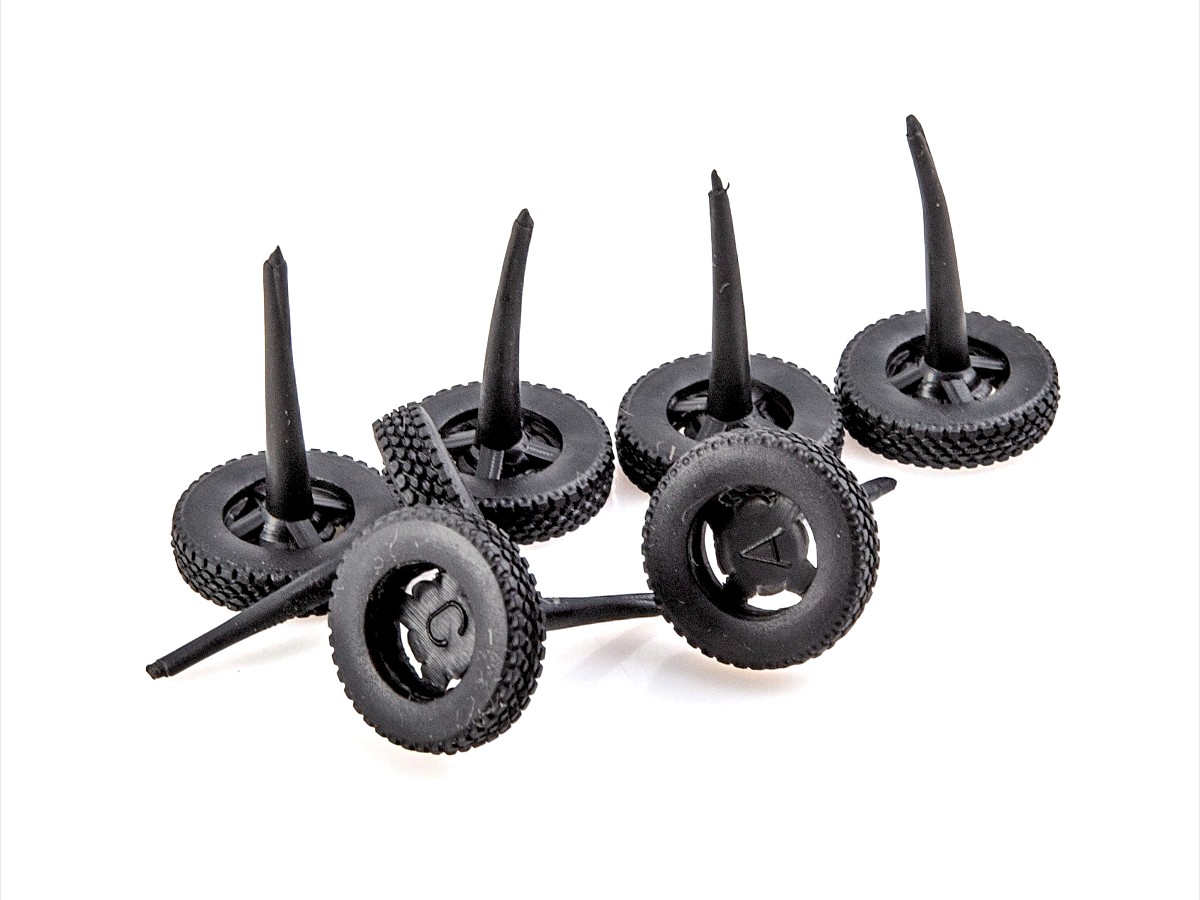 Покрышки с реалистичным рисунком протектора изготовлены из синтетической резины.
