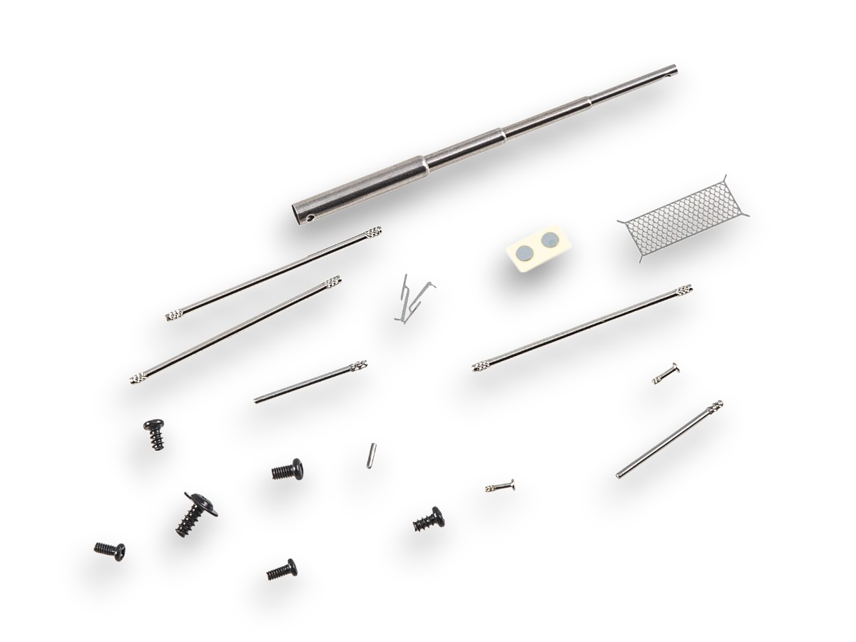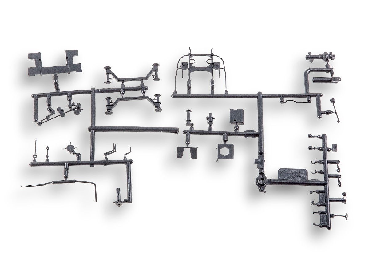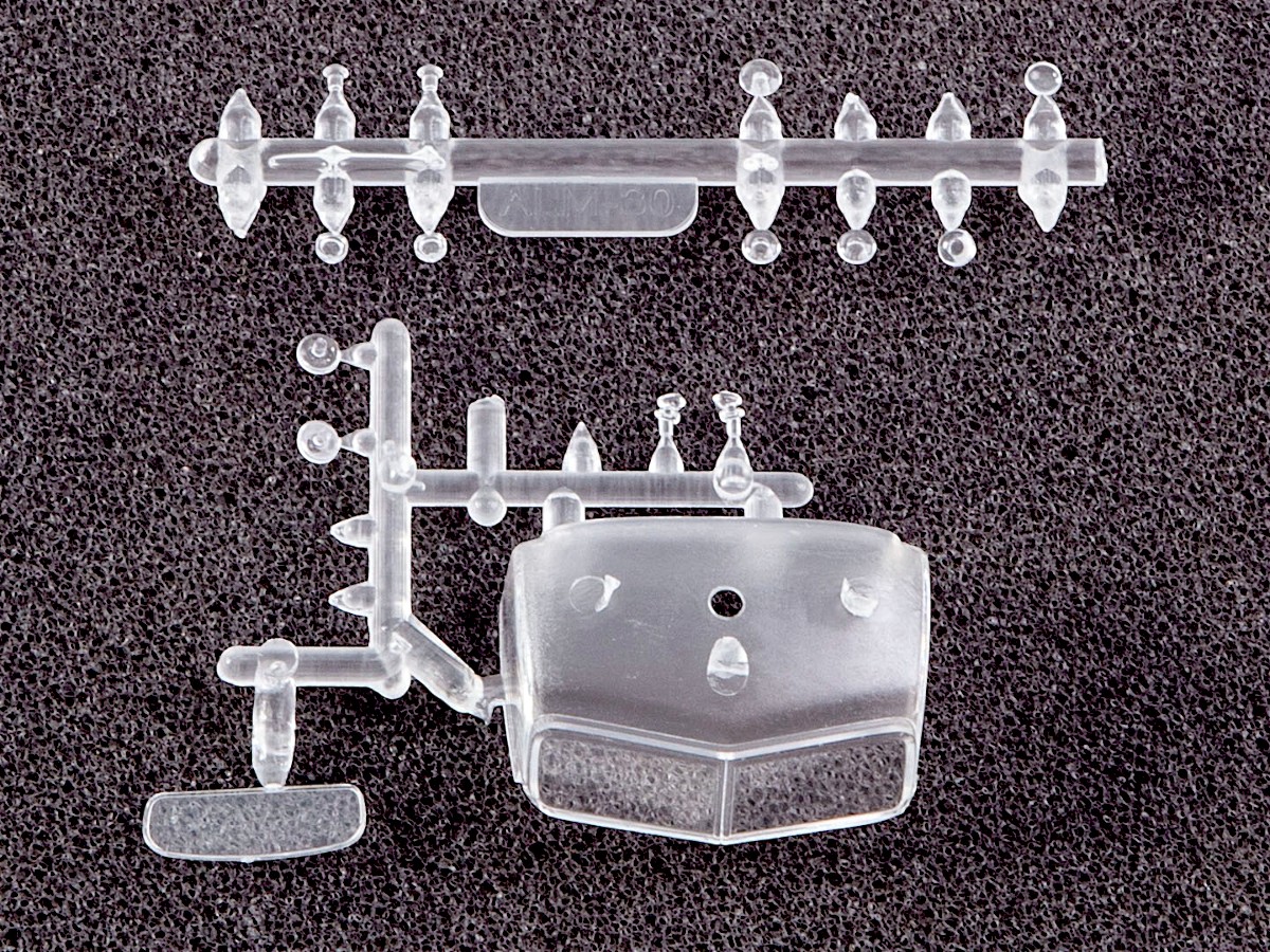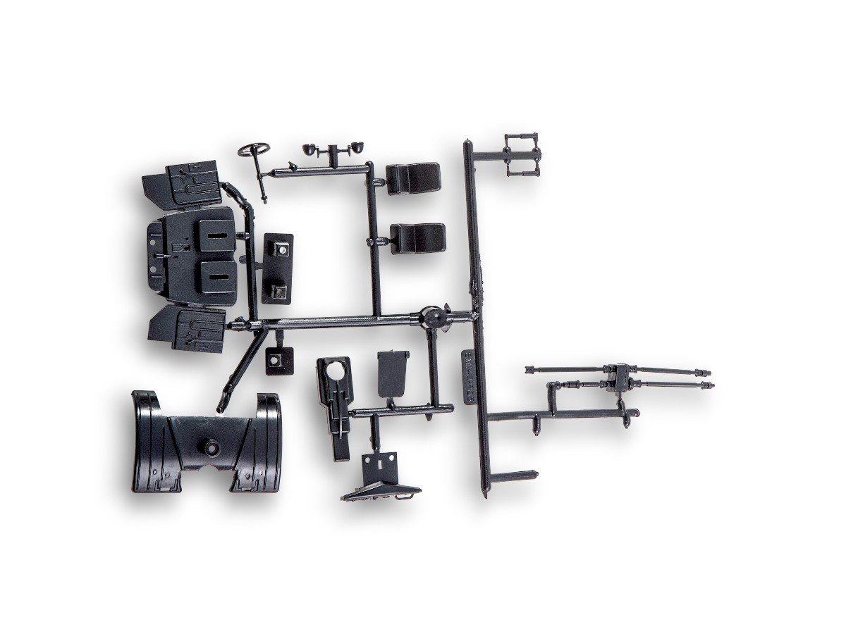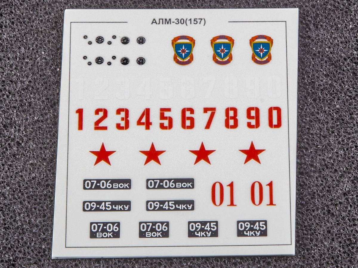 Содержит мелкие металлические элемент (оси колёс, щётки стеклоочистителей и др.), металлизированные наклейки для стёкол зеркал, цветную декаль для номерных знаков и обозначений.