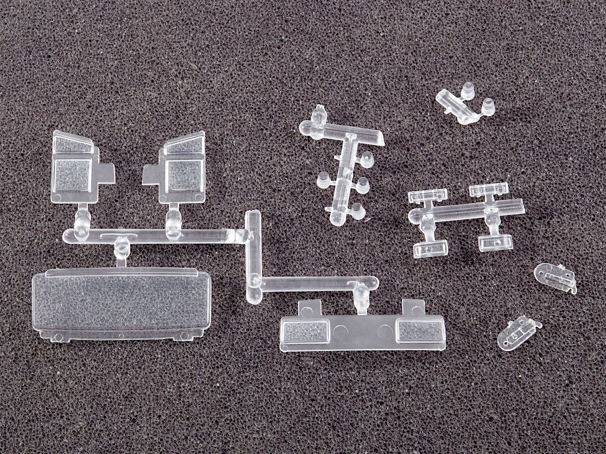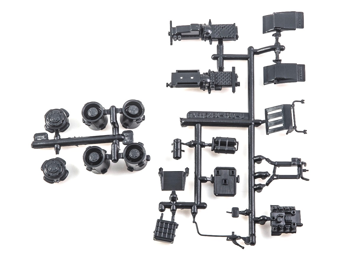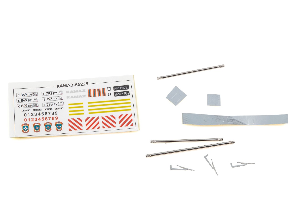 Содержит мелкие металлические элементы (оси колёс, щётки стеклоочистителей и др.), металлизированные наклейки для стёкол зеркал, цветную декаль для номерных знаков, эмблем и обозначений.