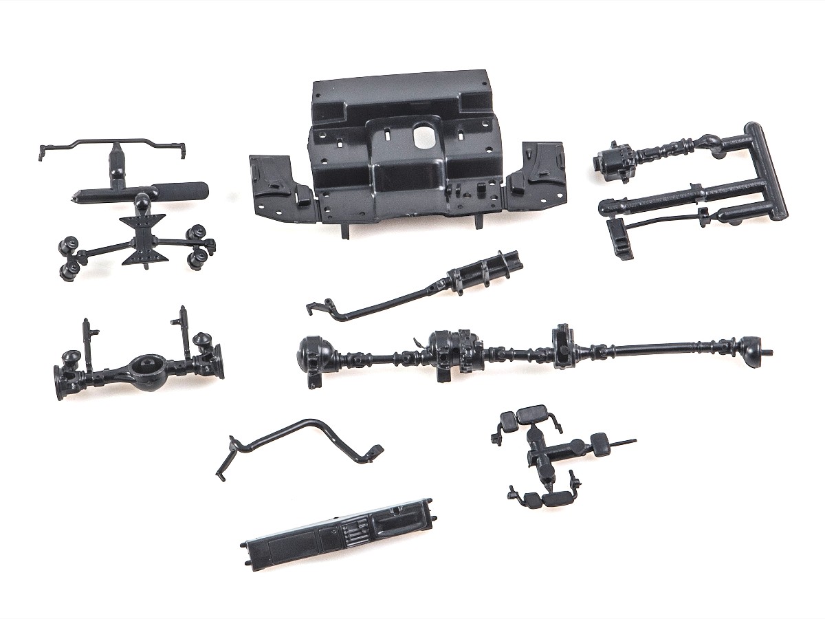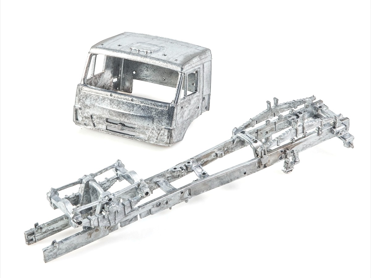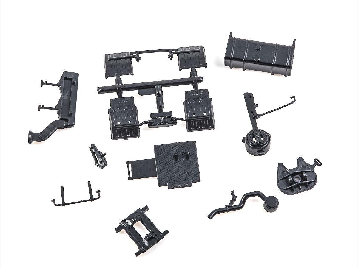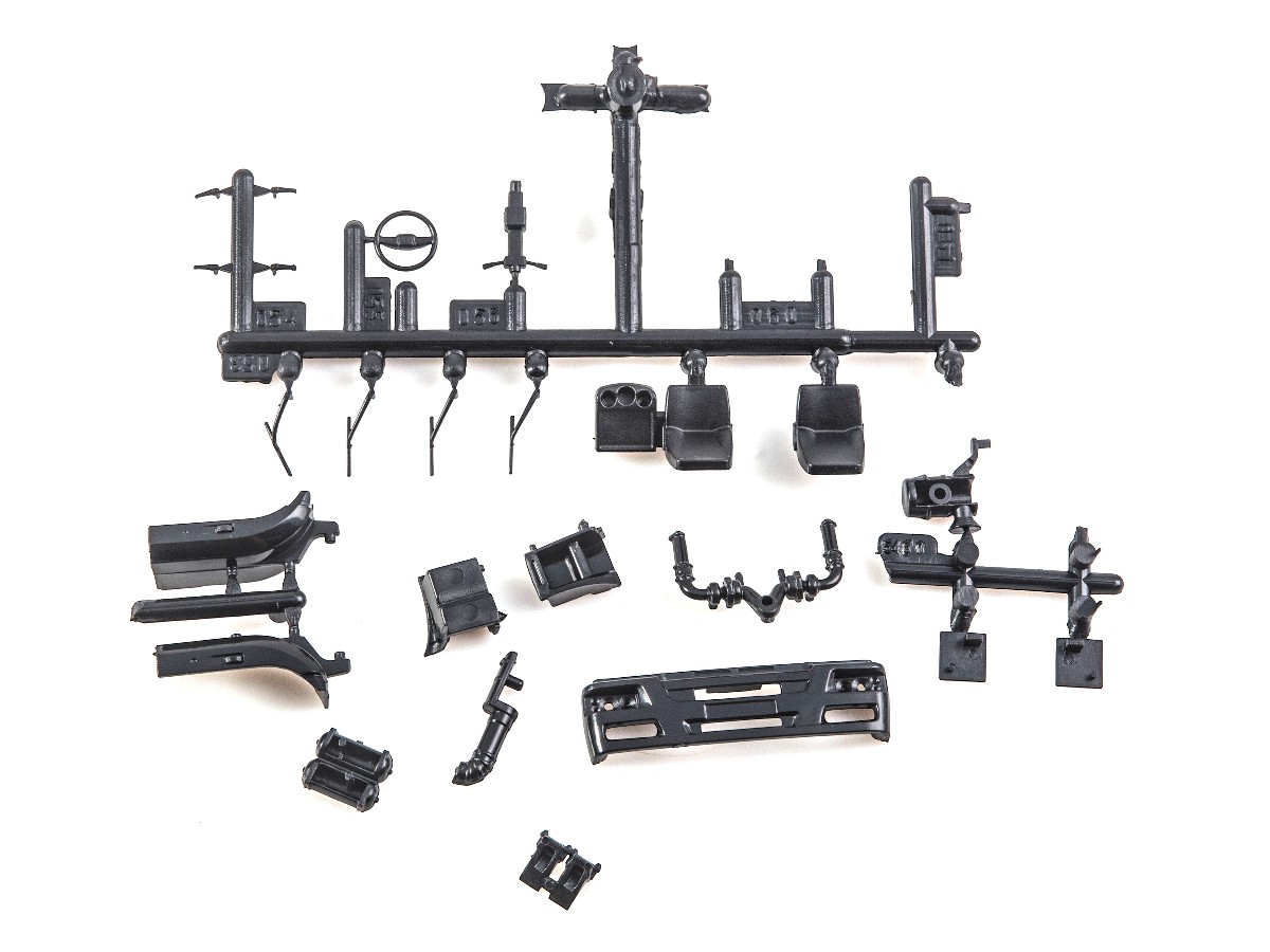Содержит мелкие металлические элементы (оси колёс, щётки стеклоочистителей и др.), металлизированные наклейки для стёкол зеркал, цветную декаль для номерных знаков, эмблем и обозначений.