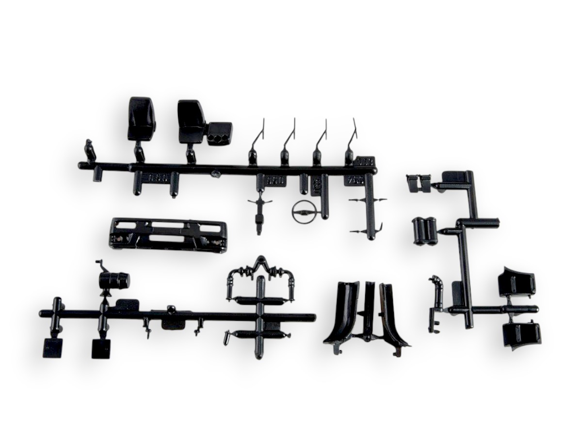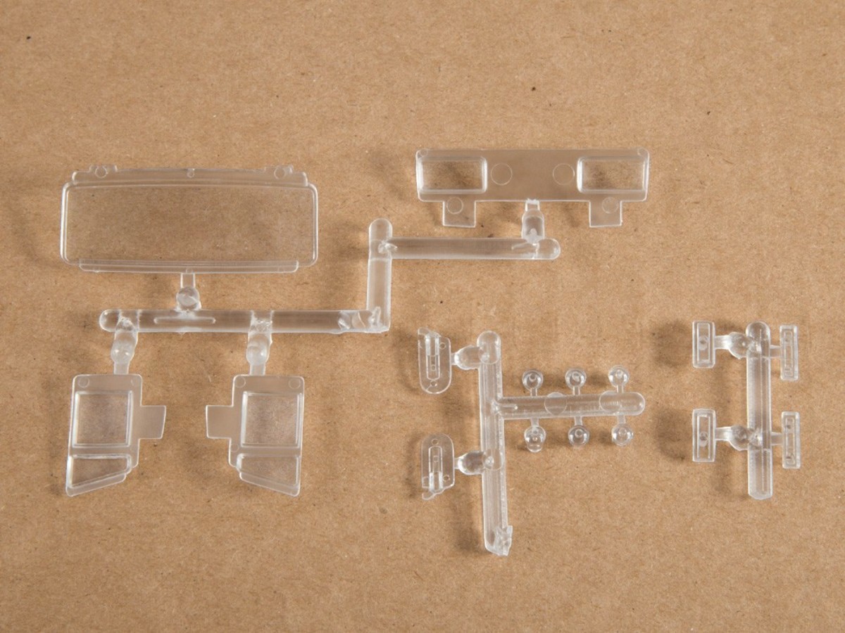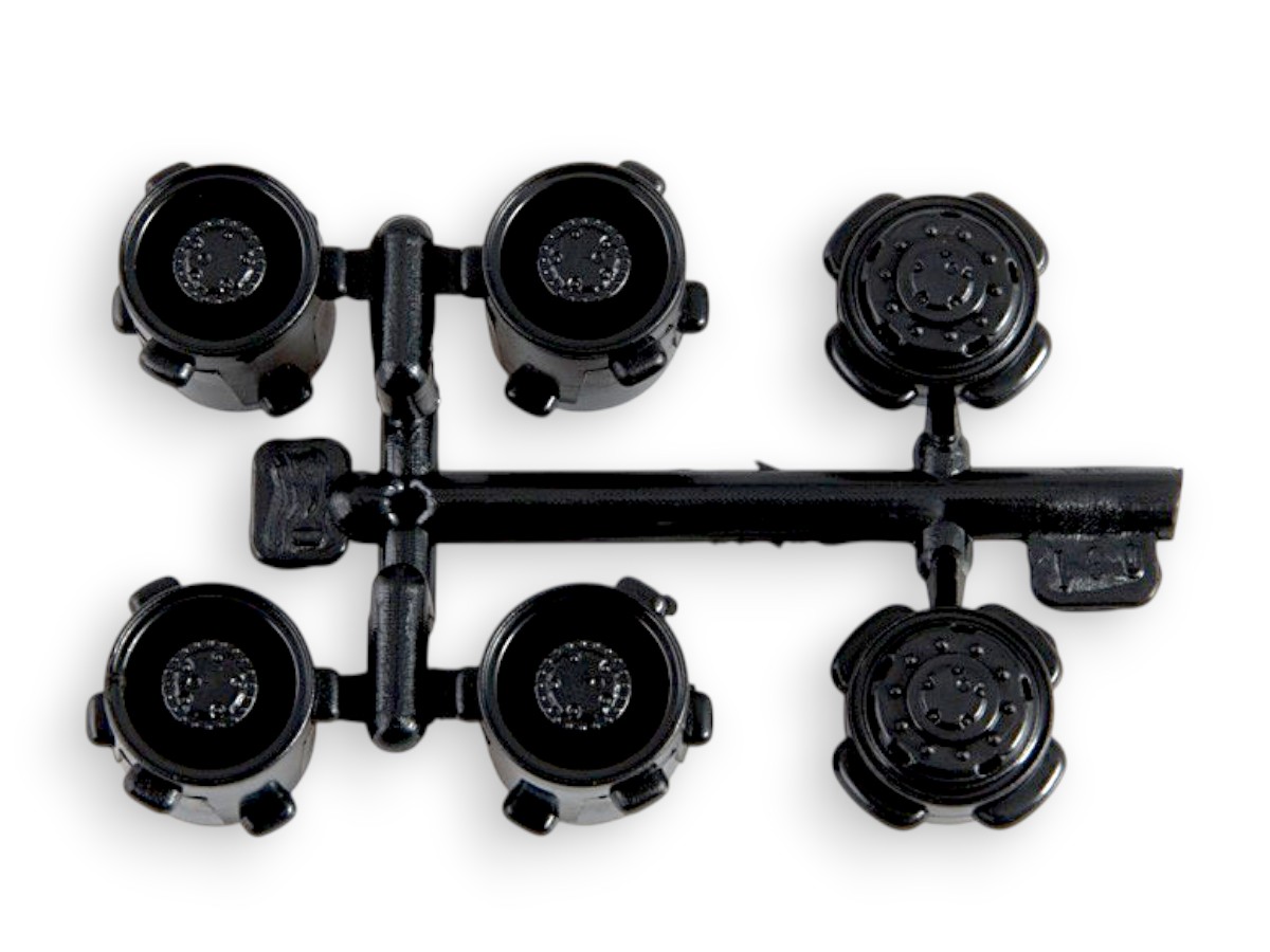 Покрышки с реалистичным рисунком протектора из синтетической резины. Детали из прозрачного пластика для элементов остекления.