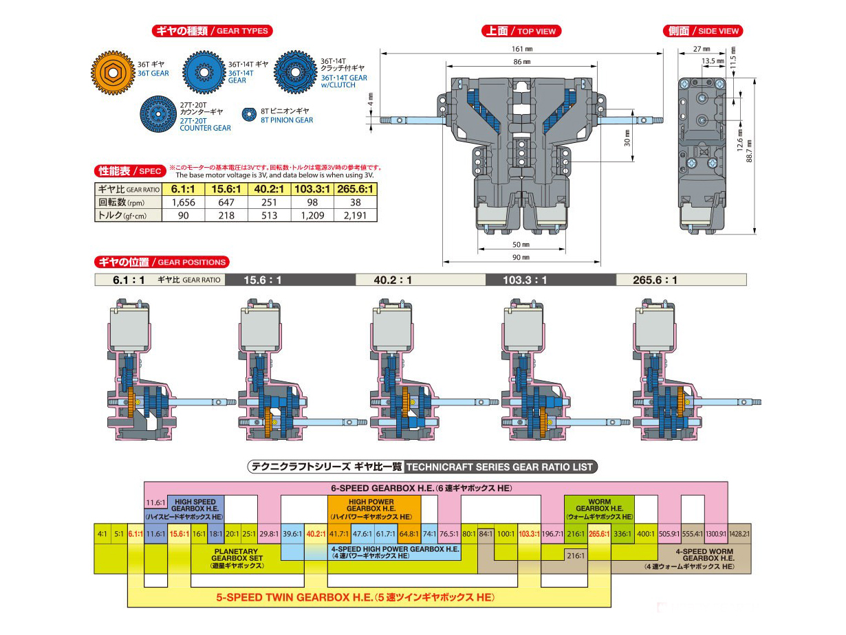 Передаточные отношения - 6.1:1, 15.6:1, 40.2:1, 103.3:1 и 265.6:1 (независимое вращение левой и правой осей). Также можно установить электромоторы тип 130.