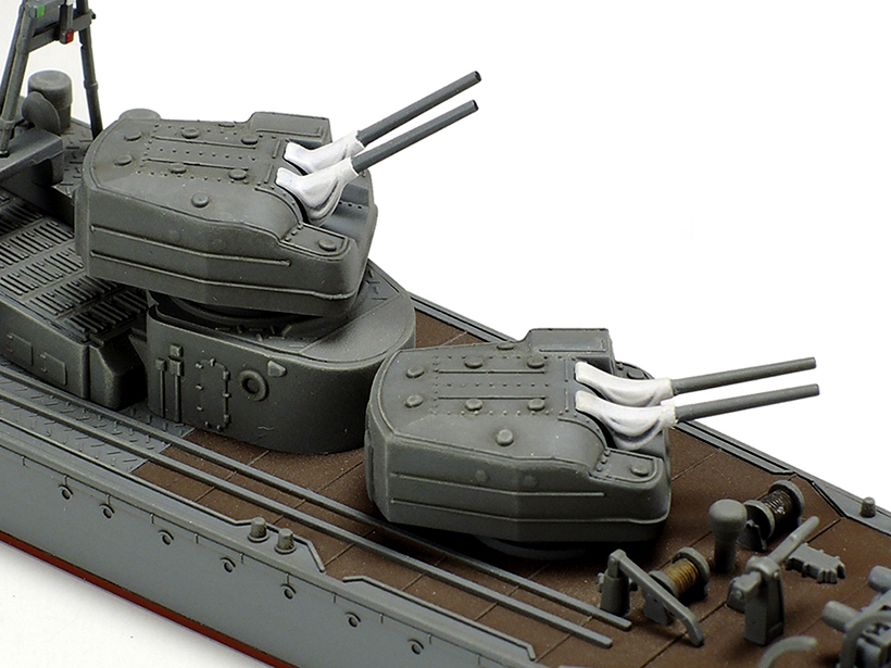Высокодетализированная модель с множеством конструктивных подробностей и элементов оснащения. Возможна сборка с целым корпусом или только надводной части корабля. В комплекте элементы фототравления, металлические детали для цепи якоря и стержней винтов.