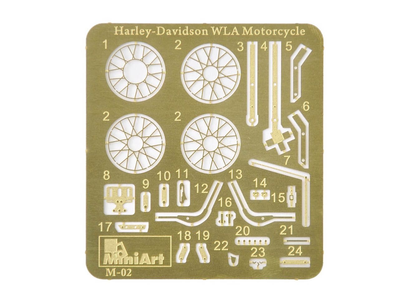 В комплекте 2 мотоцикла Harley-Davidson WLA с фототравленными элементами, декаль и 2 фигуры американских военных полицейских.