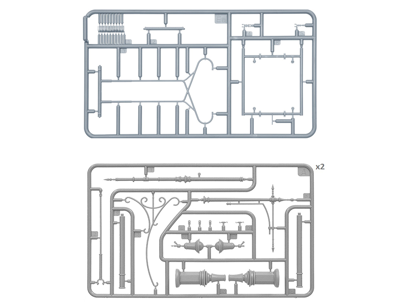 В комплекте модель европейского трамваяс элементами из прозрачного пластика для стекол, с основанием, столбами, уличными аксессуарами, экипажем и пассажирами.
