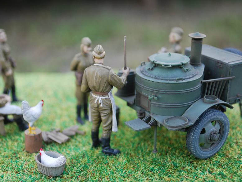 В комплекте модель полевой кухни КП-42 и фигуры 4-х пехотинцев.