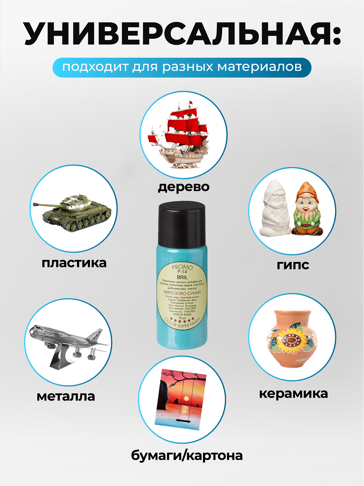 Используется в моделировании для покраски масштабных моделей, росписи фигурок, миниатюр, рисования на изделиях из пластика, смолы, дерева, металла, гипса, глины, бумаги и других материалов.