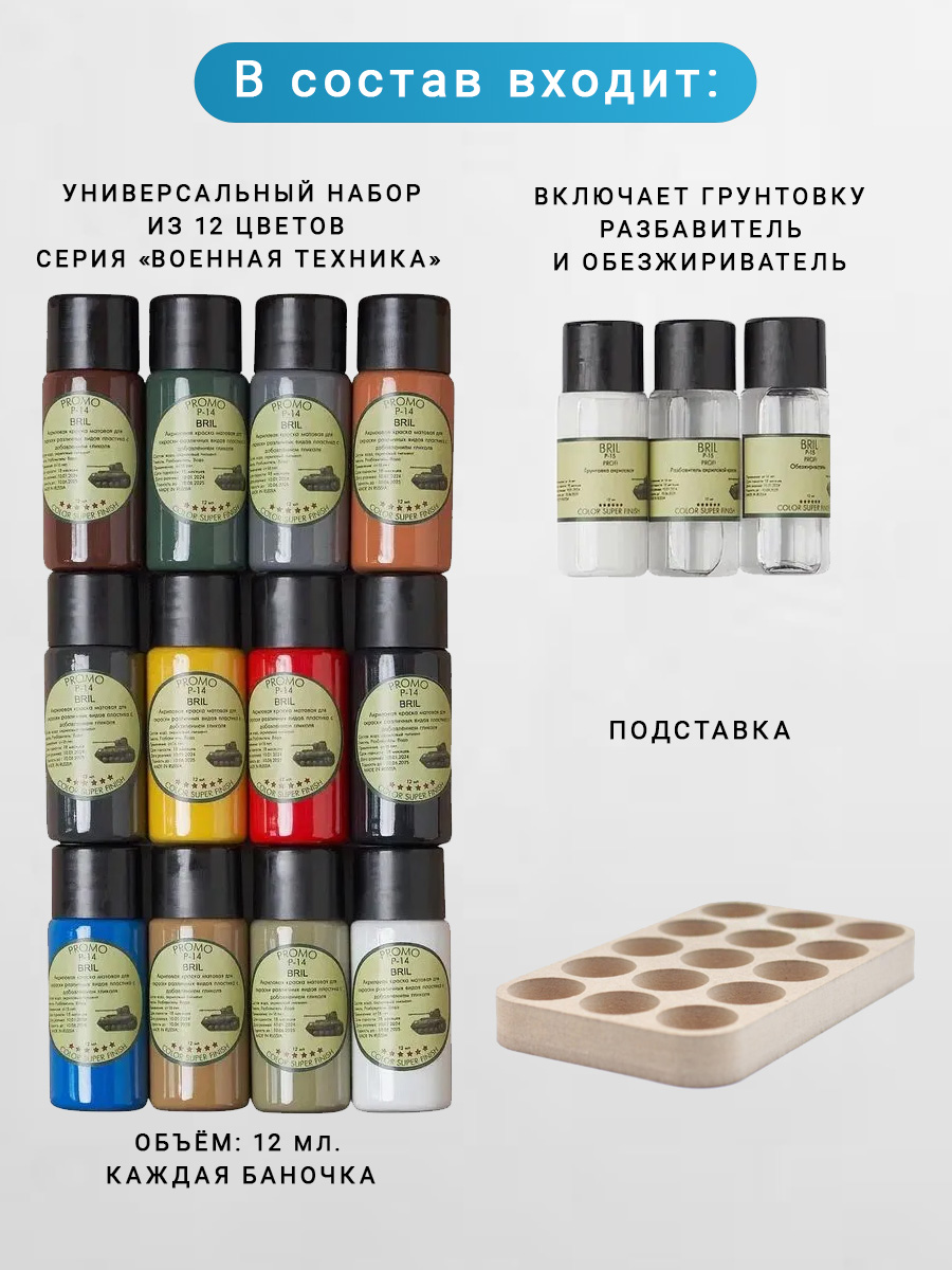 Набор акриловых красок BRIL для сборных моделей и миниатюр, 12 цветов/12 мл, Серия: Военная техника