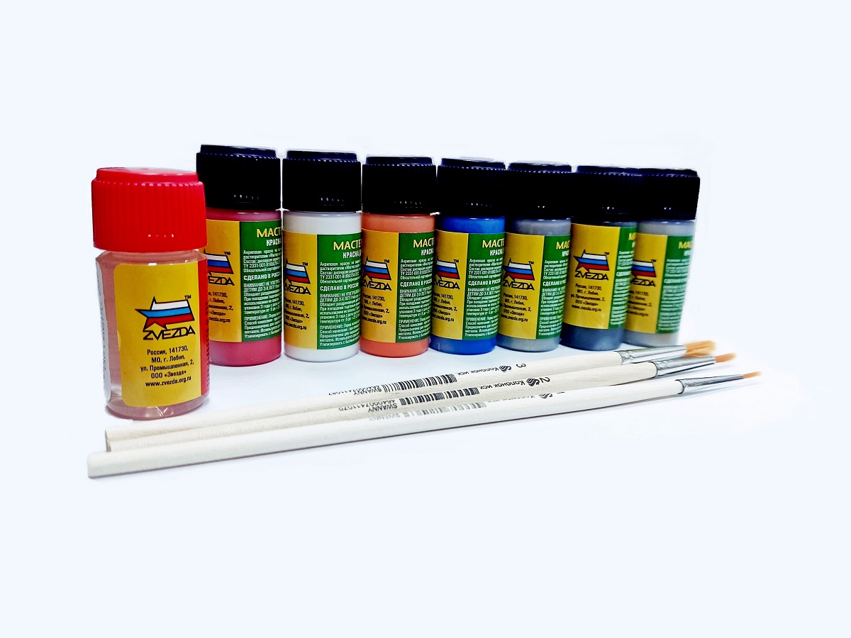 Набор включает в себя все цвета краски по номерам, согласно инструкции, специальный клей для моделей и комплект из 3-х кисточек разного размера.
