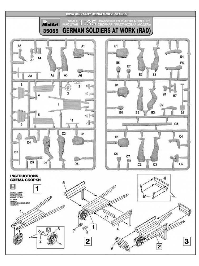 В комплекте 5 фигур немецких солдат, тачка, лопаты, кирка.