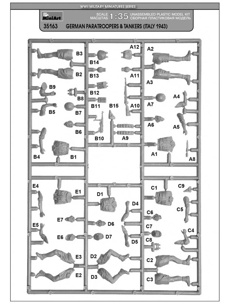 Набор пластиковых элементов для сборки фигур немецких десантников и танкистов (Италия 1943) в масштабе 1:35.