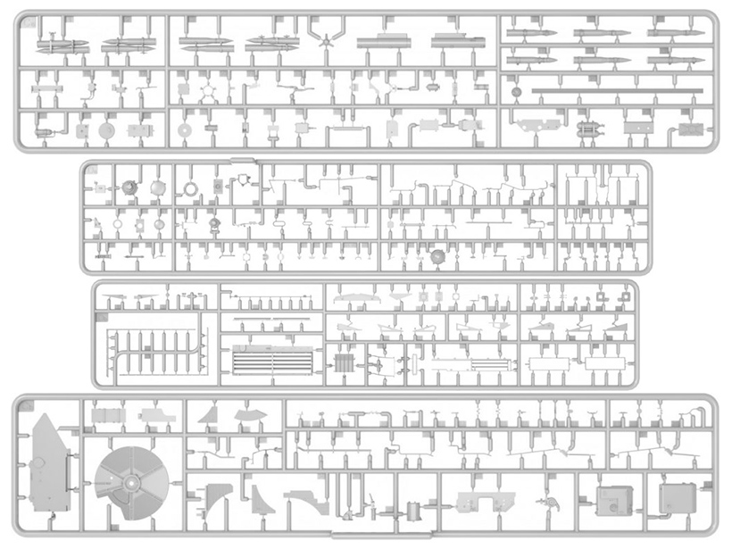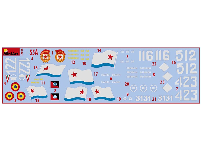В комплекте высокодетальная модель танка серии 55 А с подробно проработанной ходовой, боевым отделением, моторным отсеком и вооружением, подвижными гусенечными цепями и рабочими торсионами, с элементами из прозрачного пластика, с фототравленными элементами брони, декаль для 9 вариантов, полный комплект боеприпасов.