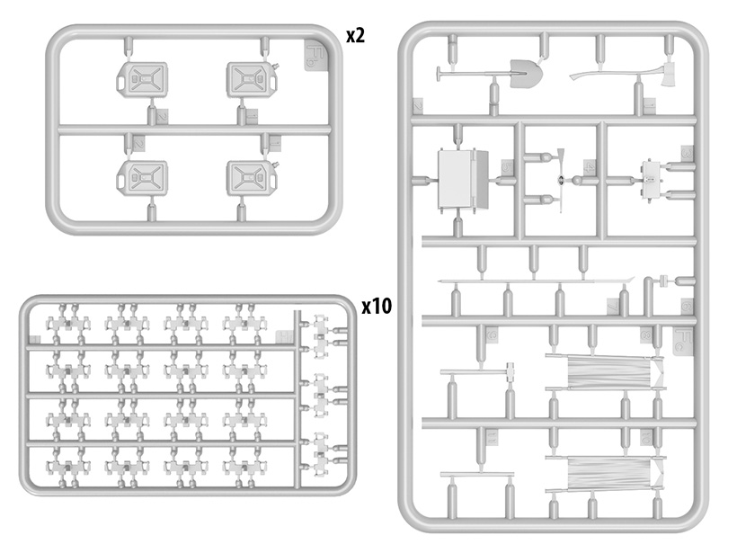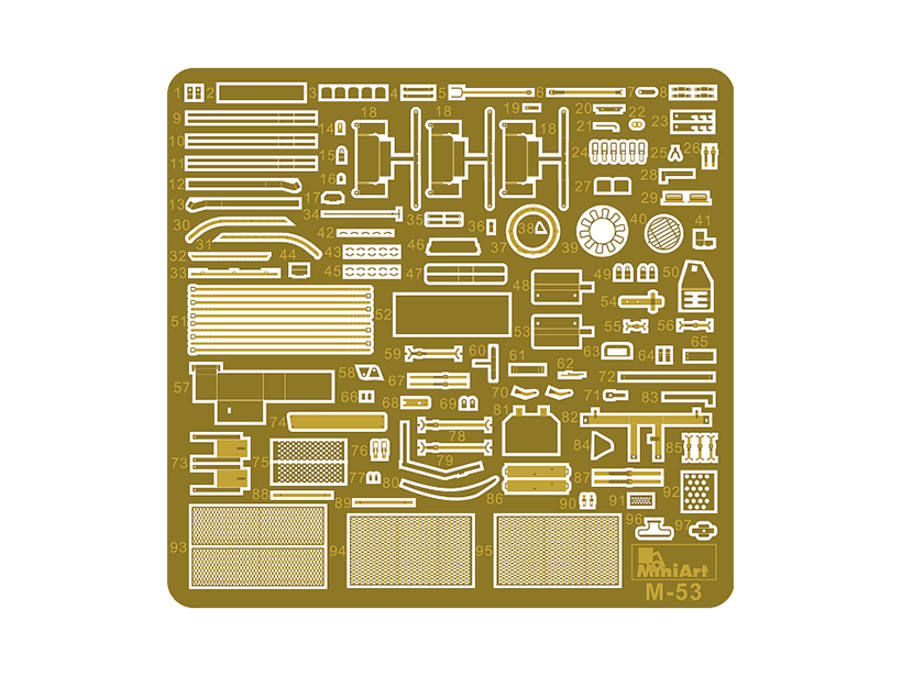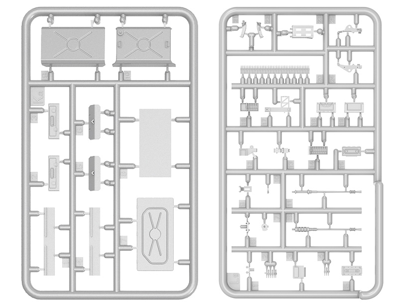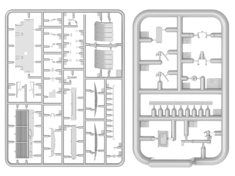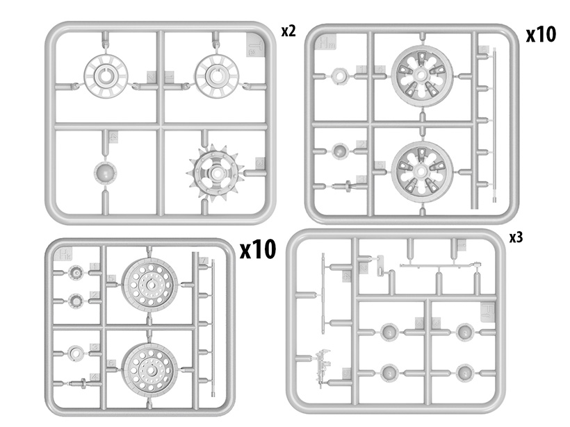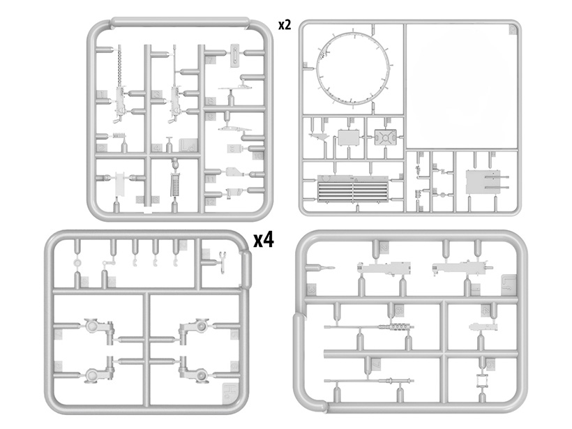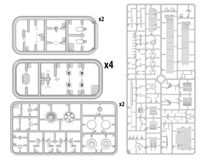 В комплекте высокодетальная модель танка Тиран 4 с подробно проработанной ходовой, подвижными гусенечными цепями и рабочими торсионами, с элементами из прозрачного пластика, с фототравленными элементами брони, декаль для 6 вариантов, полный комплект боеприпасов, 2 типа опорных катков, 2 вида орудий.
