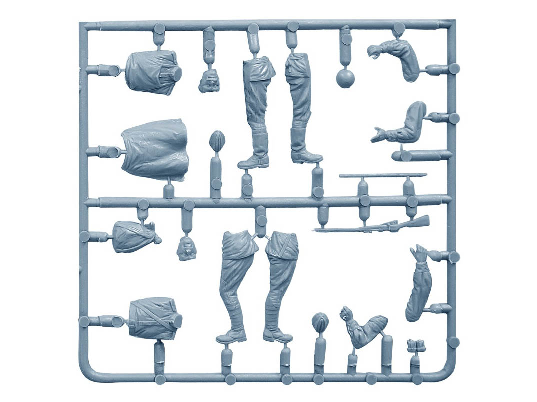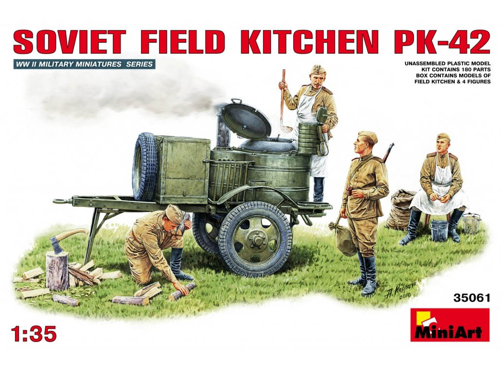 В комплекте модель полевой кухни КП-42 и фигуры 4-х пехотинцев.
