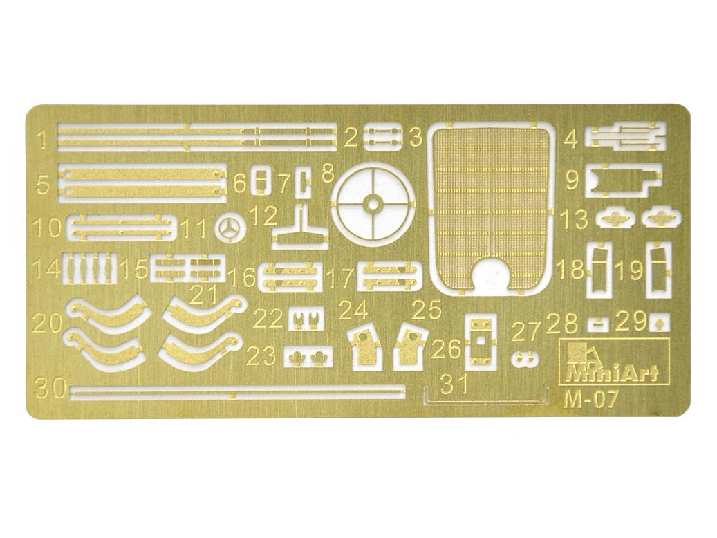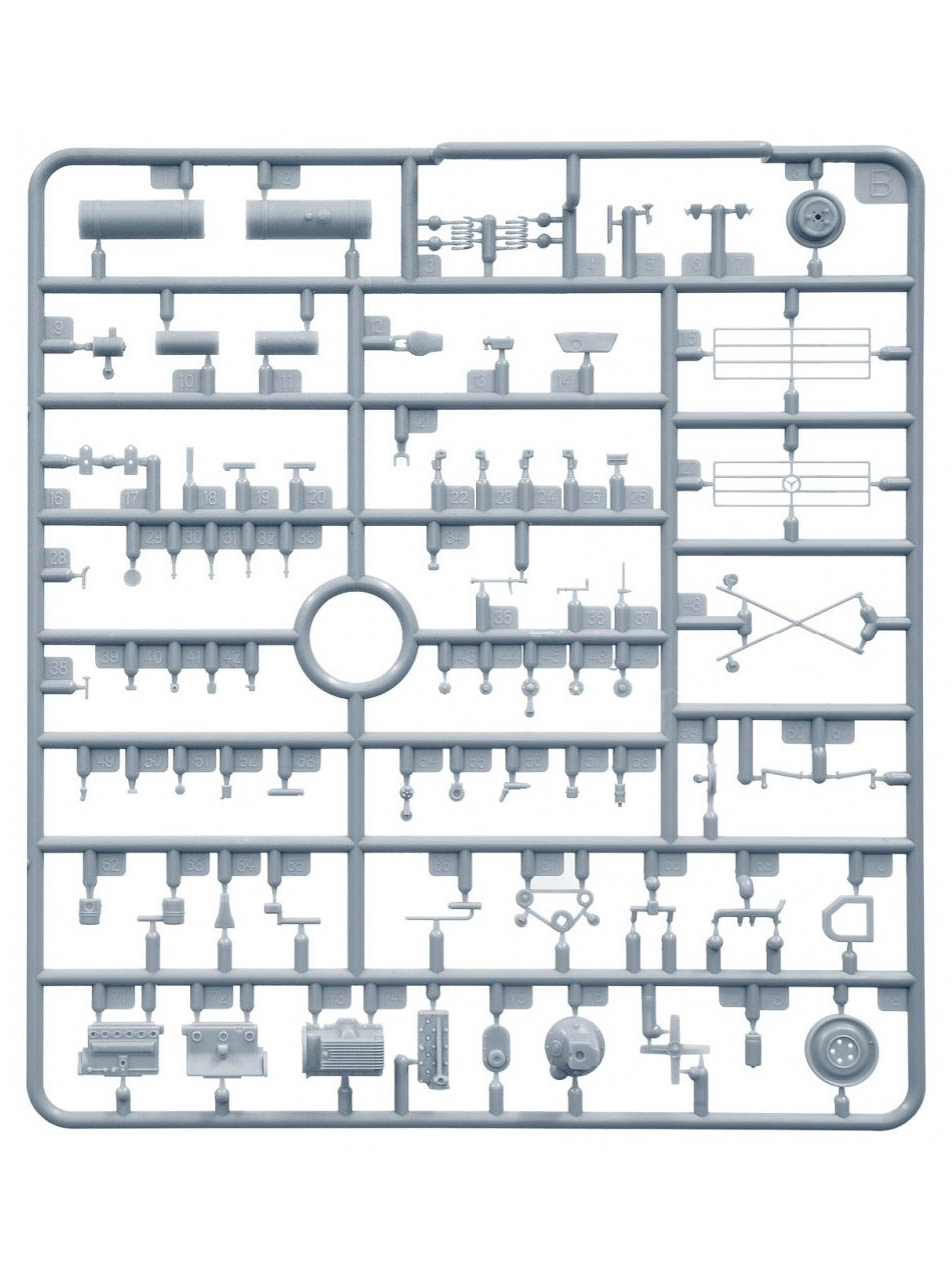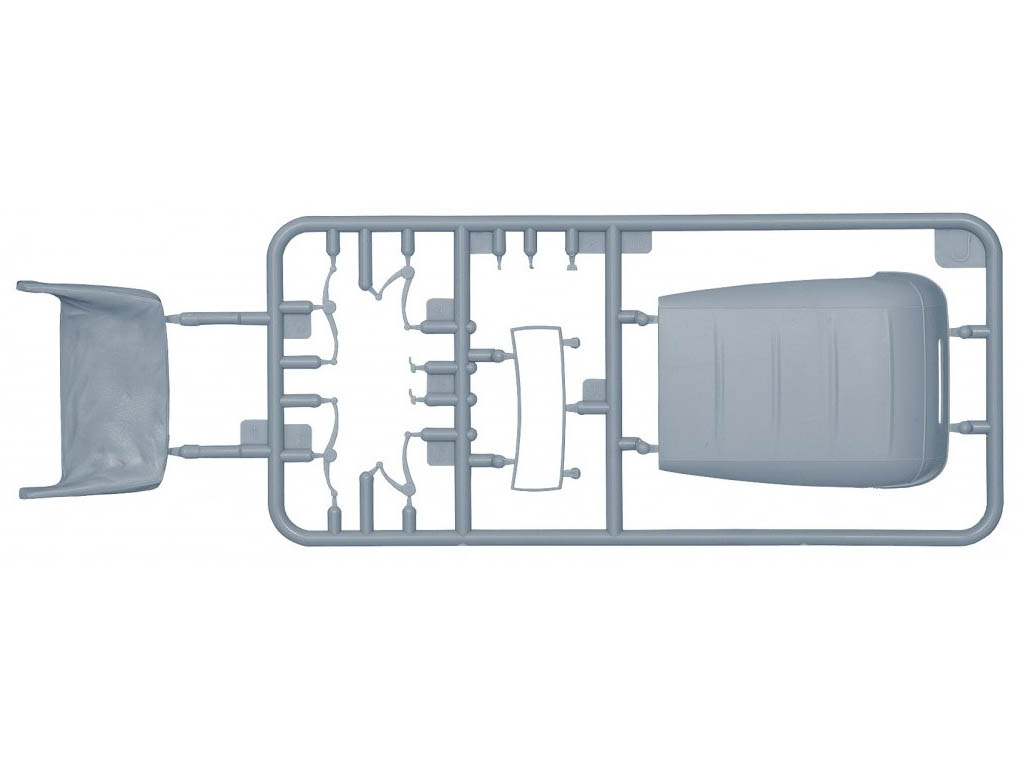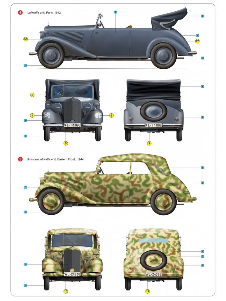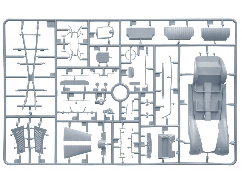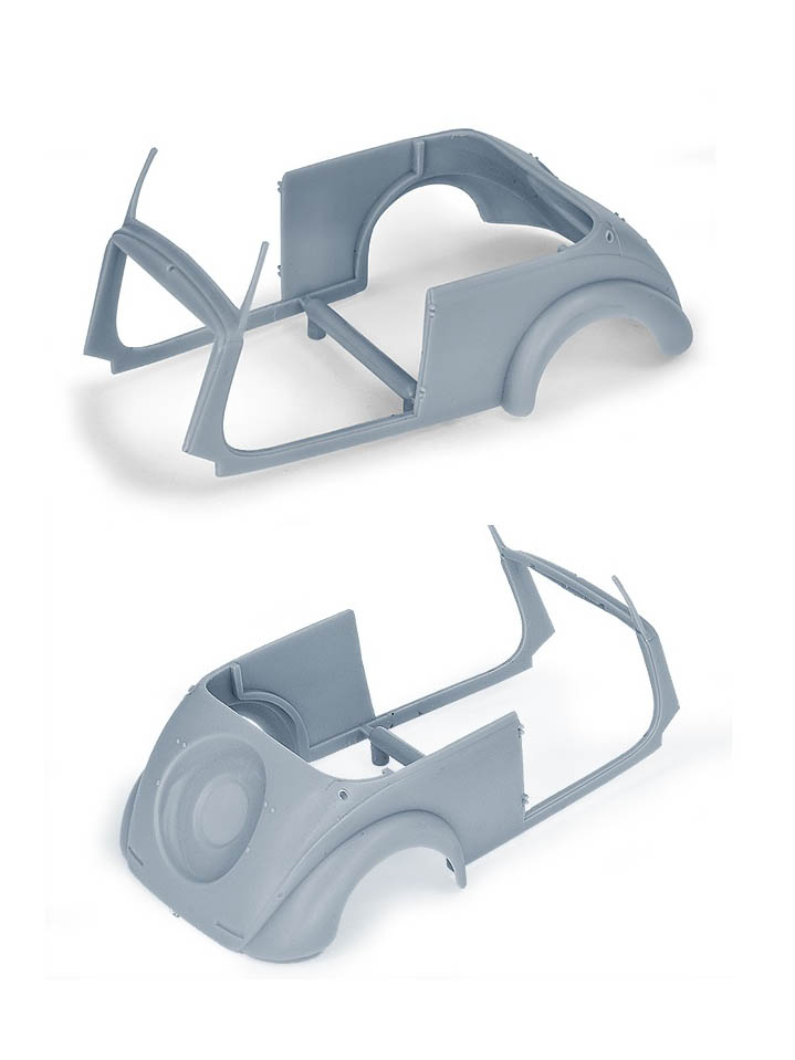 В комплекте элементы из прозрачного пластика для стекол кабины и фар, реалистично выполненные крыша кабриолета в 2-х вариантах исполнения с открытым и закрытым верхом, элементы кузова и салона, фототравленные элементы, декаль.
