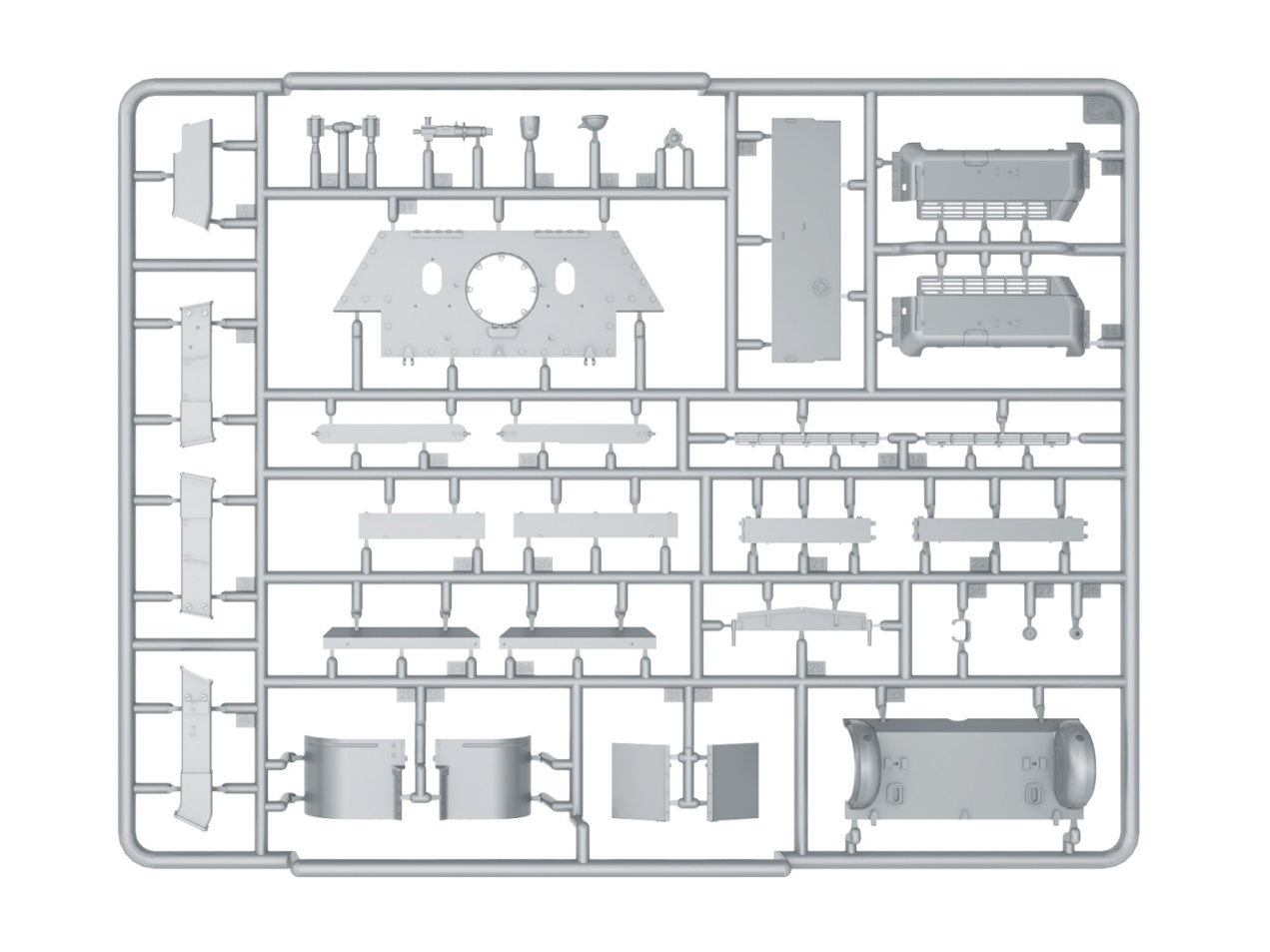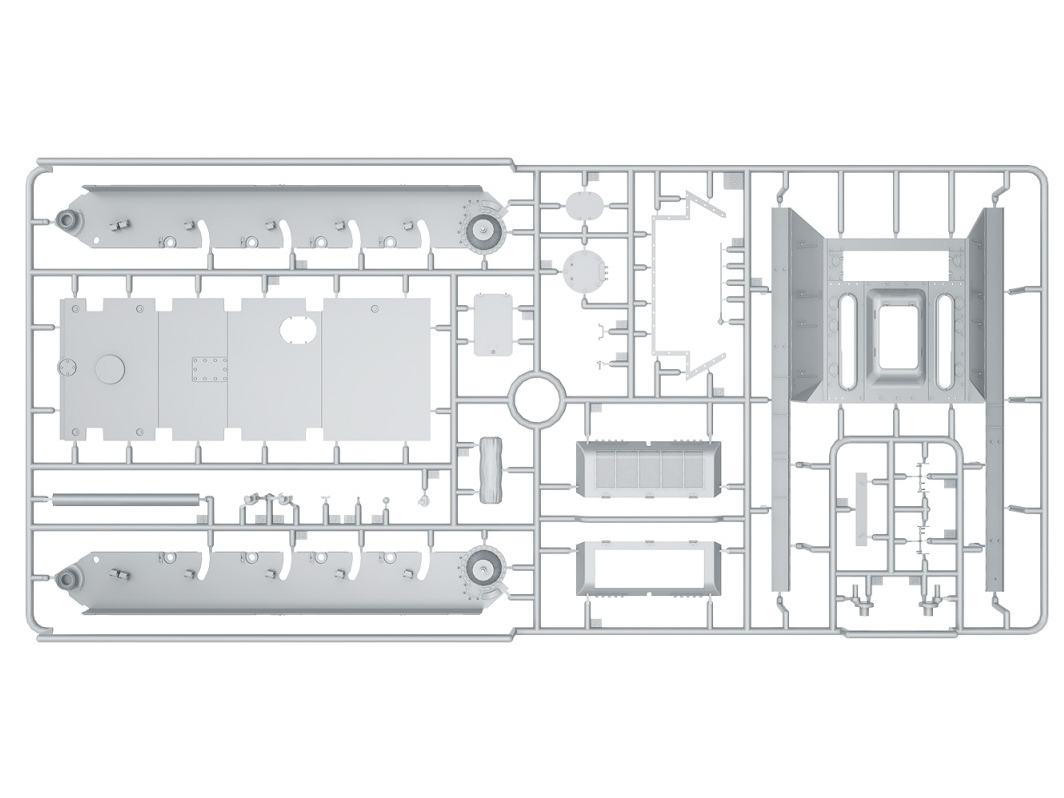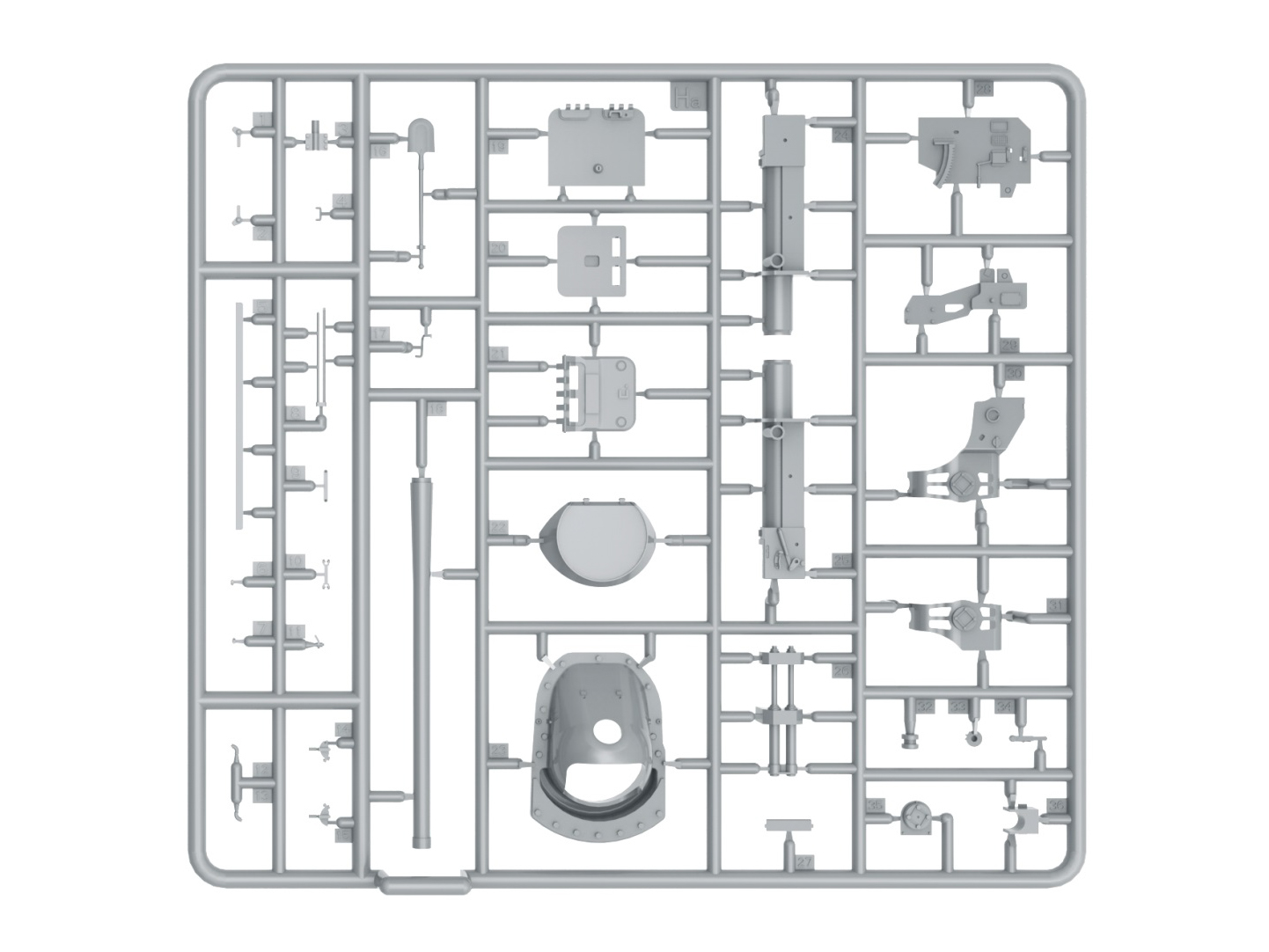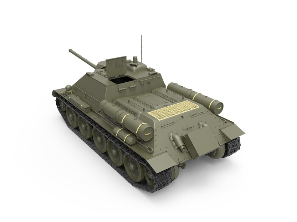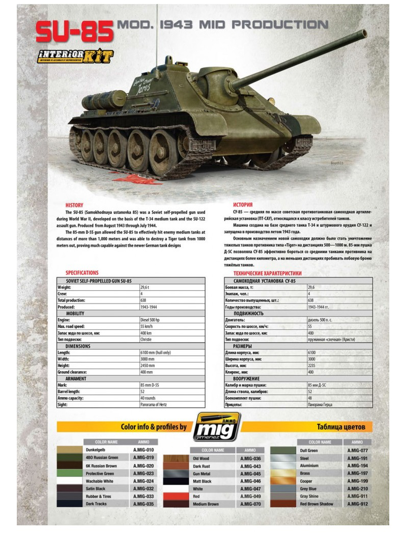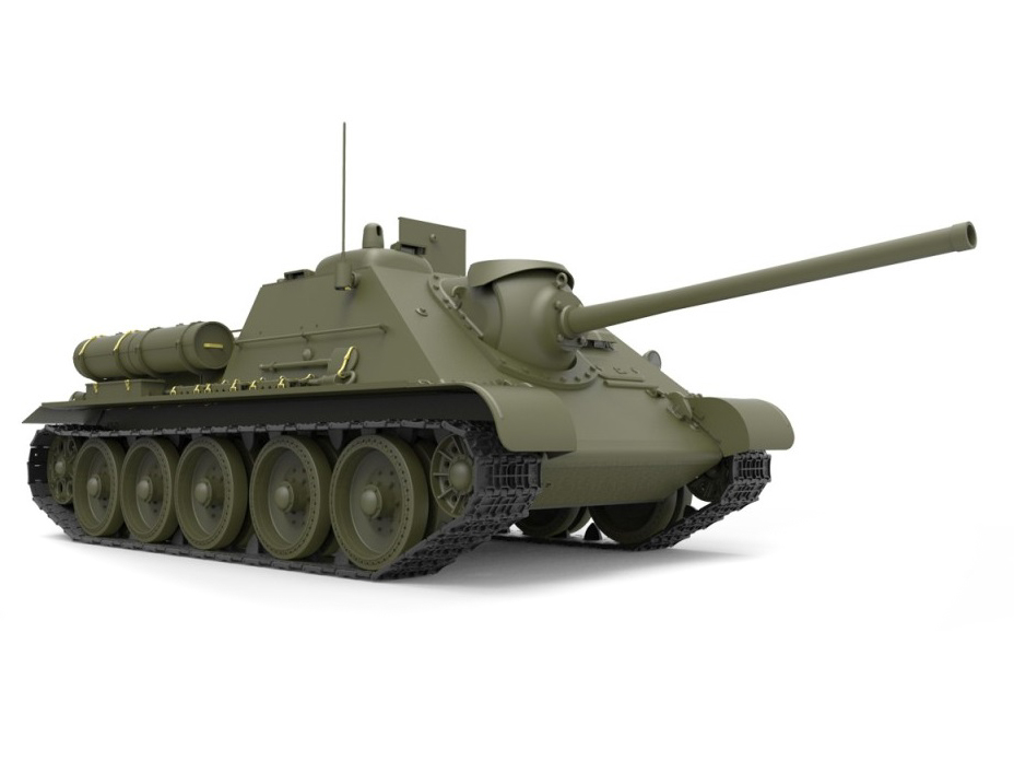 В комплекте полноцветная инструкция, высокодетальная модель СУ-85 с подробно проработанной ходовой, боевым отделением, моторным отсеком и трансмиссией, подвижными гусенечными цепями, с элементами из прозрачного пластика для боевых перископов, с фототравленными элементами брони, декаль.