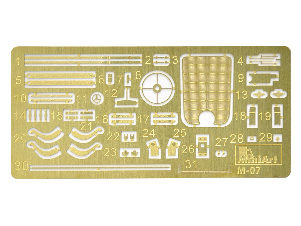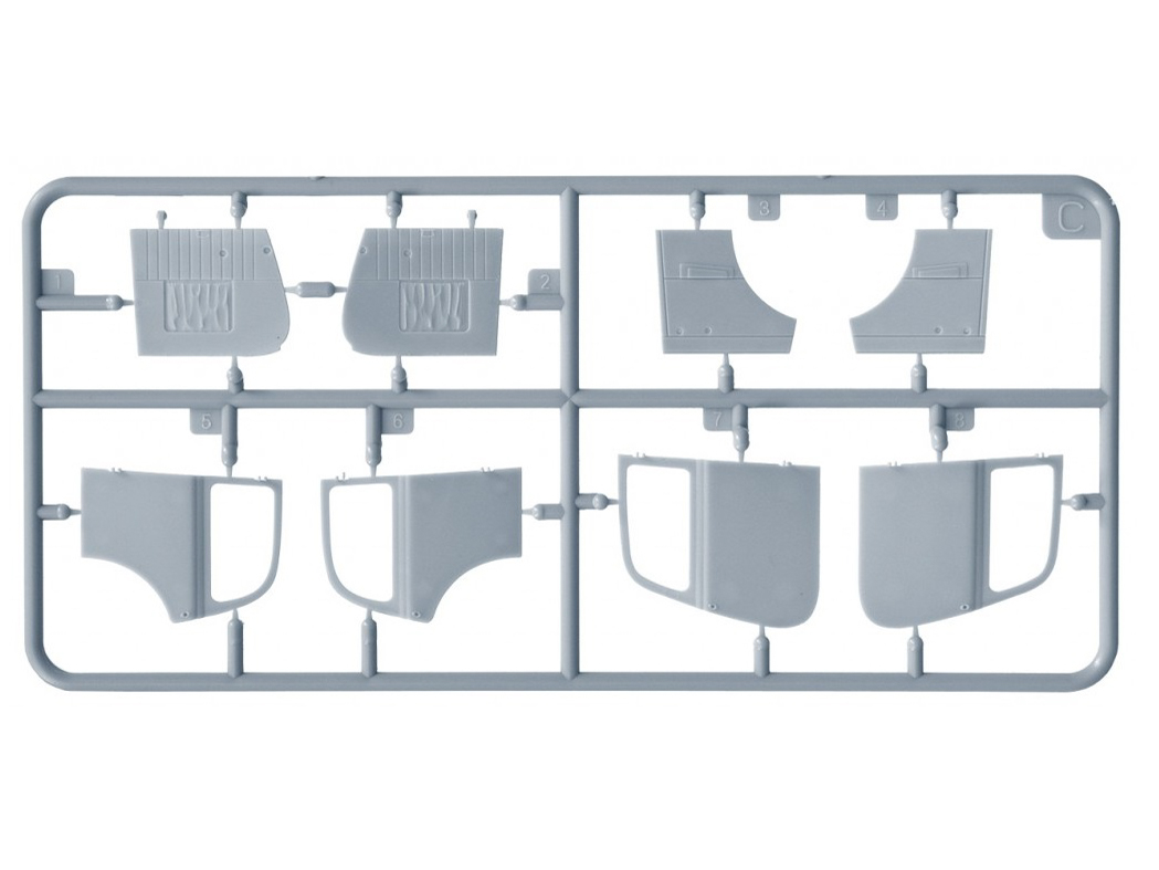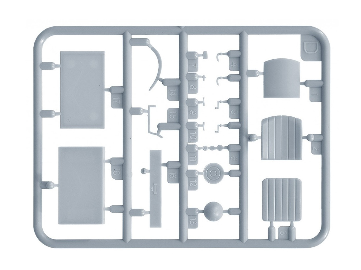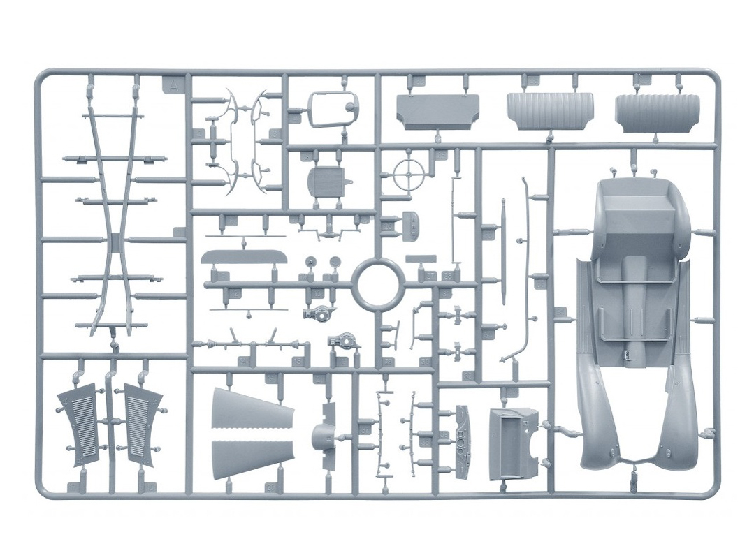 В комплекте элементы из прозрачного пластика для стекол кабины и фар, реалистично выполненные элементы кузова, кабины и ходовой части, детально проработанные узлы и агрегаты, фототравленные элементы, декаль для 11 вариантов сборки и фигура водителя.
