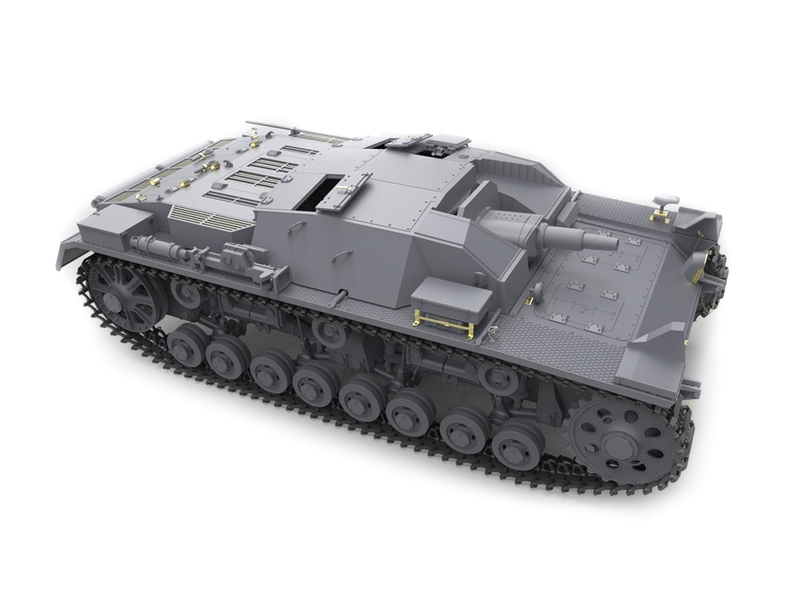 В комплекте полноцветная инструкция, высокодетальная модель STUG. III «0» cерии с подробно проработанной ходовой, подвижными гусенечными цепями, с элементами из прозрачного пластика для боевых перископов и фар, с фототравленными элементами брони, декаль в 3 вариантах исполнения.